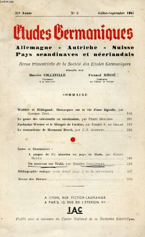 Société des Etudes Germaniques - IAC. 1956. In-8. Broché. Etat d'usage, Tâchée, Dos fané, Intérieur acceptable. Paginé de 194 à 288. Annotations sur le 1er plat. Quelques annotations dans le texte.. . . . Classification Dewey : 943-Allemagne, Autriche, Hongrie