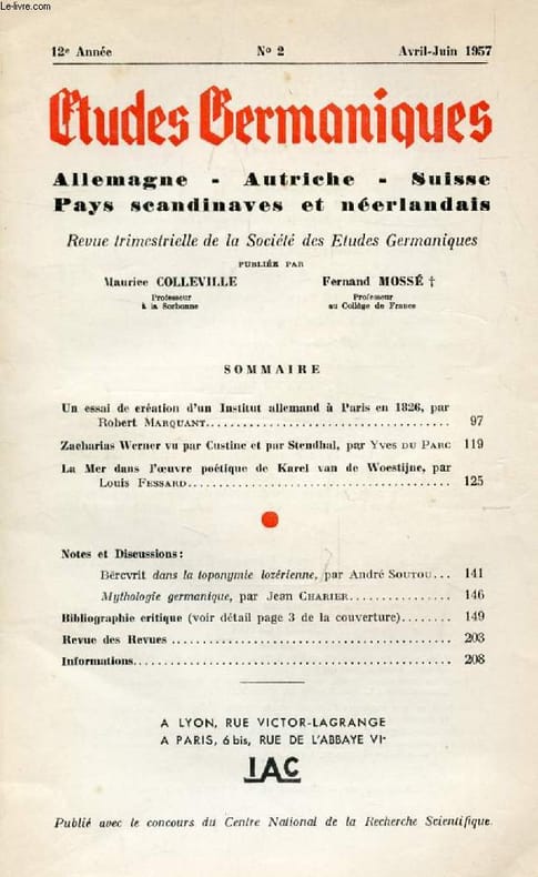 Sommaire: Un essai de création d’un Institut allemand à Paris en 1826, par Robert Marquant. Zacharias Werner vu par Custine et par Stendhal, par Yves du Parc. La Mer dans l’oeuvre poétique de Karel van de Woestijne, par Louis Fessard... Classification Dewey : 943-Allemagne, Autriche, Hongrie