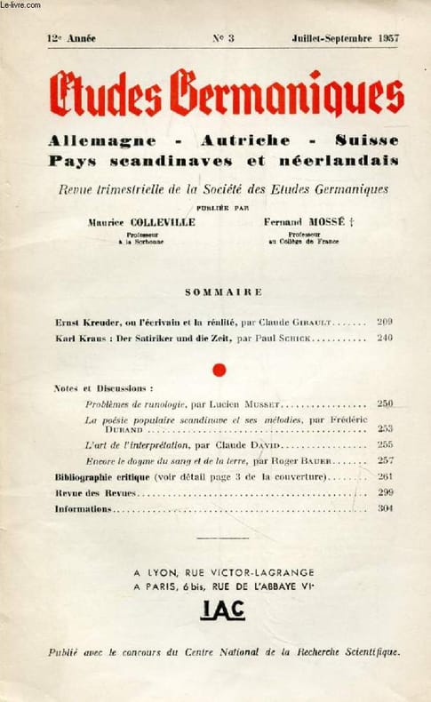 Sommaire: Ernst Kreuder, ou l’éerivain et la réalité, par Claude Girault. Karl Kraus : Der Satiriker und die Zeit, par Paul Schick. Notes et Discussions : Problèmes de runologie, par Lucien Müsset. La poésie populaire scandinave et ses mélodies, par Frédéric Durand... Classification Dewey : 943-Allemagne, Autriche, Hongrie