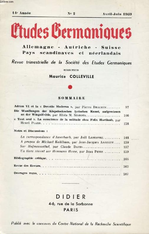 Société des Etudes Germaniques - Didier. 1959. In-8. Broché. Bon état, Couv. convenable, Dos fané, Intérieur acceptable. Paginé de 98 à 208. Quelques annotations au crayon dans le texte.. . . . Classification Dewey : 943-Allemagne, Autriche, Hongrie
