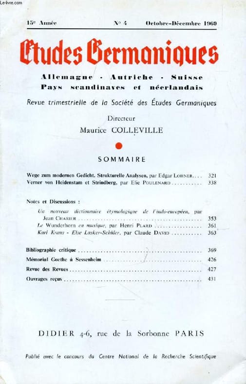 Sommaire: Wege zum modernen Gedicht. Strukturelle Analysen, par Edgar Lohner. Verner von Heidenstam et Strindberg, par Elie Poulenard. Notes et Discussions : Un nouveau dictionnaire étymologique de l'indo-européen, par Jean Charier. Le Wunderhorn en musique, par Henri Plard. Karl Kraus - Else Lasker-Schüler, par Claude David... Classification Dewey : 943-Allemagne, Autriche, Hongrie