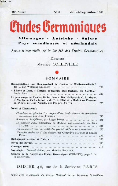 Société des Etudes Germaniques - Didier. 1961. In-8. Broché. Bon état, Couv. légèrement passée, Dos satisfaisant, Intérieur acceptable. Paginé de 210 à 320.. . . . Classification Dewey : 943-Allemagne, Autriche, Hongrie