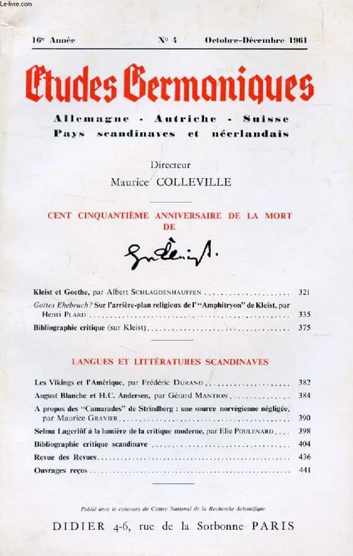 "Sommaire: CENT CINQUANTIÈME ANNIVERSAIRE DE LA MORT DE KLESIT. Kleist et Goethe, par Albert Schlagdenhauffen. Gottes Ehebruch ? Sur l’arrière-plan religieux de l' ""Amphitryon"" de Kleist, par Henri Plard. Bibliographie critique (sur Kleist). LANGUES ET LITTÉRATURES SCANDINAVES. Les Vikings et l’Amérique, par Frédéric Durand. August Blanche et H.C. Andersen, par Gérard Mantion. Selma Lagerlöf à la lumière de la critique moderne, par Elie Poulenard... Classification Dewey : 943-Allemagne, Autriche, Hongrie"