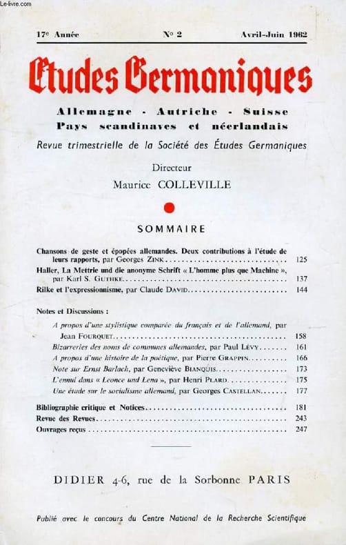Sommaire: Chansons de geste et épopées allemandes. Deux contributions à l’étude de leurs rapports, par Georges Zink. Haller, La Mettrie und die anonyme Schrift « L’homme plus que Machine », par Karl S. Guthke. Rilke et l’expressionnisme, par Claude David. Notes et Discussions : A propos d'une stylistique comparée du français et de l'allemand, par Jean Fourquet. Bizarreries des noms de communes allemandes, par Paul Lévy. A propos d'une histoire de la poétique, par Pierre Grappin. Note sur Ernst Bar lach, par Geneviève Bianquis... Classification Dewey : 943-Allemagne, Autriche, Hongrie