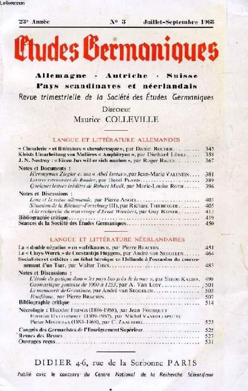 Sommaire: LANGUE ET LITTÉRATURE ALLEMANDES. « Chevalerie » et littérature « chevaleresque », par Daniel Rocher. Kleists Umarbeitung von Molières « Amphitryon », par Diethard Lübke . J. N. Nestroy : « Einen Jux will er sich machen », par Roger Bauer. Notes et Documents : Hieronymus Ziegler et son « Abel Iustus», par Jean-Marie Valentin. Lettres retrouvées de Baader, par Henri Plard. Quelques lettres inédites de Robert Musil, par Marie-Louise Roth. Notes et Discussions : Lenz et la scène allemande, par Pierre Angel. Situation de la Büchner-Forschung (II), par Richard Thieberger. A la recherche du vrai visage d'Ernst Wiechert, par Guy Reiner. Bibliographie critique. Séances de la Société des Études Germaniques. LANGUE ET LITTÉRATURE NÉERLANDAISES. La « double négation » en « afrikaans », par Pierre Brachin. Le « Cluys-Werck » de Constantijn Huygens, par André van Seggelen. Socialistes et esthètes : un débat héroïque en Hollande à l’occasion du couronnement d’un Tsar, par Walter Thys... Classification Dewey : 943-Allemagne, Autriche, Hongrie