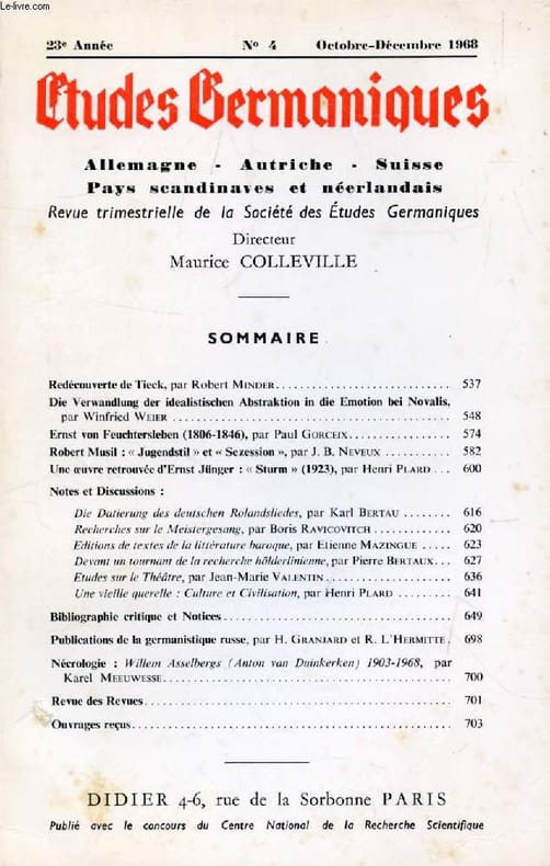Sommaire: Redécouverte de Tieck, par Robert Minder. Die Verwandlung der idealistischen Abstraktion in die Emotion bei Novalis, par Winfried Weie. Ernst von Feuchter sieben (1806-1846), par Paul Gorceix. Robert Musil : « Jugendstil » et « Sezession », par J. B. Neveux. Une oeuvre retrouvée d’Ernst Jünger : « Sturm » (1923), par Henri Plard. Notes et Discussions : Die Datierung des deutschen Rolandsliedes, par Karl Bertau. Recherches sur le Meistergesang, par Boris Ravicovitch. Editions de textes de la littérature baroque, par Etienne Mazingue. Devant un tournant de la recherche hölderlinienne, par Pierre Bertaux. Etudes sur le Théâtre, par Jean-Marie Valentin. Une vieille querelle : Culture et Civilisation, par Henri Plard... Classification Dewey : 943-Allemagne, Autriche, Hongrie