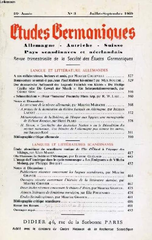 Sommaire: LANGUE ET LITTERATURE ALLEMANDES. A nos collaborateurs, lecteurs et amis, par Maurice Colleville. Bonaventure ne serait-il pas Jean Paul Richter lui-même ? par Max Rouché. Der dramatische Aufbaustil der Legende Heinrich von Kleists « Die Heilige Cäcilie oder Die Gewalt der Musik ». Ein Interpretationsversuch, par Günter Graf. « Schneethlehem » : Four 'Nonsense' Poems by Hans Arp, par R. W. Last . Notes et Discussions: La structure de la phrase allemande, par Maurice Marache. A propos de la domination du théâtre français en Allemagne, par Jacques Laçant. Métamorphoses de la Bohème, de Murger aux hippies: une monographie de Helmut Kreuzer, par Henri Plard. H. Simon, « Geschichte der deutschen Nation » ou la Démolition des mythes nationaux. Une histoire de l'VAllemagne pas comme les autres, par Jacques Ridé. Bibliographie critique allemande. LANGUES ET LITTÉRATURES SCANDINAVES. Étude phonétique du scandinave runique de l’île d’Öland à l’époque des Vikings, par Alain Marez. Ola Hansson : la Suède et l’Allemagne, par Étienne Guélaud. L’image de l’Amérique dans le cycle romanesque « Les Émigrants » de Vilhelm Moberg, par Philippe Bouquetj... Classification Dewey : 943-Allemagne, Autriche, Hongrie