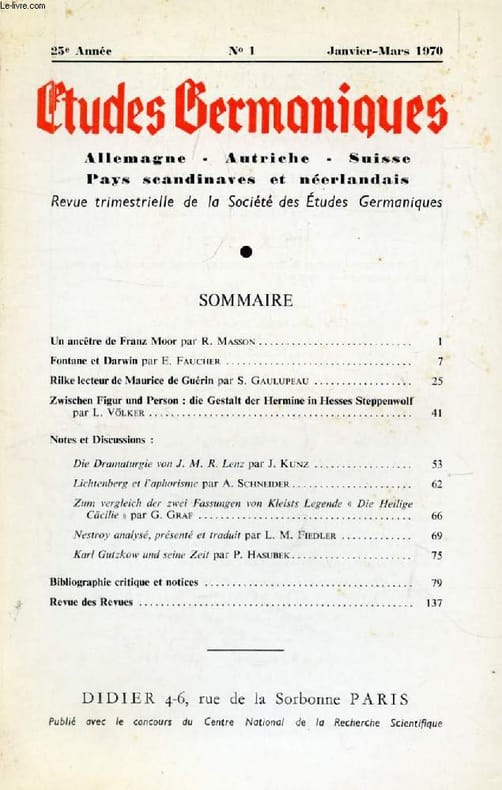 Société des Etudes Germaniques - Didier. 1970. In-8. Broché. Etat d'usage, Couv. convenable, Coiffe en tête abîmée, Intérieur acceptable. 140 pages.. . . . Classification Dewey : 943-Allemagne, Autriche, Hongrie