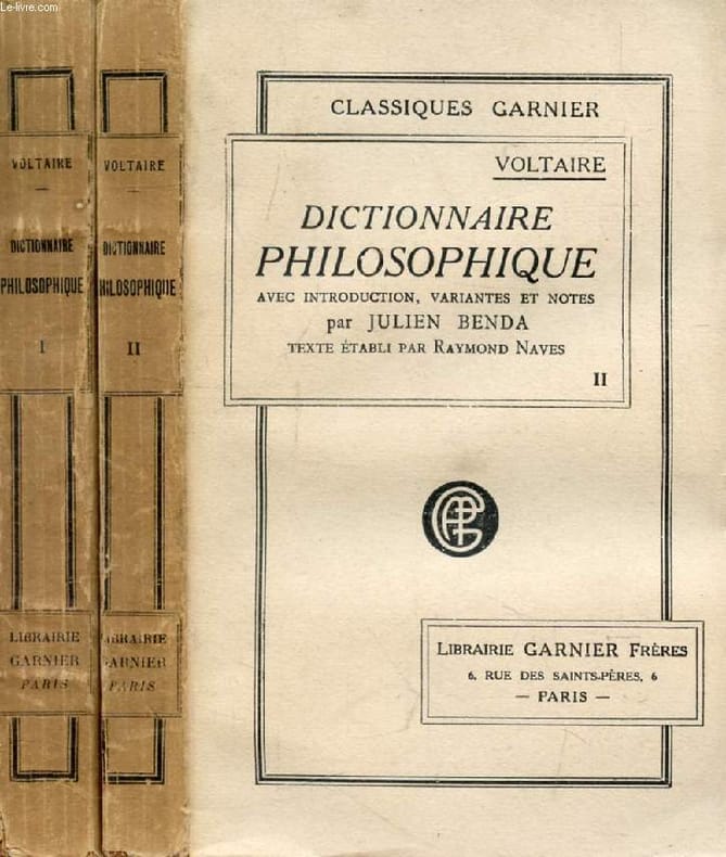 Classiques Garnier. Comprenant les 118 articles parus sous ce titre du vivant de Voltaire avec leurs suppléments parus dans les Questions sur l'Encyclopédie. Avec Intro., Variantes et Notes par Julien BENDA. Texte établi par Raymond NAVES. Classification Dewey : 840.05-XVIII ème siècle