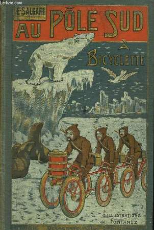 Grand in 8 percaline bleue de l’éditeur,bords à biseaux,plaque polycchrome animée sur le premier plat( Trois hommes en trycicle sur la banquise avec phoques et ours blanc.titre doré sur fond orangé,titre doré avec pingouin au dos.Faux-titre-titre illustré en médaillon 240 pages,tranches dorées,illustrations dans le texte de Cazenove et Fontanez.Delagrave éditeur sans date (1905).Rousseurs habituelles.dos légèrement frotté.Bon premier plat.