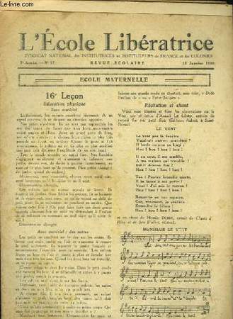 SYNDICAT NATIONAL DES INSTITUTEURS DE FRANCE ET DES COLONIES. 11 janvier 1936. In-8. En feuillets. Etat d'usage, 1er plat abîmé, Dos satisfaisant, Intérieur frais. Paginé de 335 à 408. Quelques figures et partitions (accompagnées de chants) dans le texte. Dos fendu. Manque en marges sur les 3 premières pages, n'altérant pas la lecture du texte.. . . . Classification Dewey : 370-Education