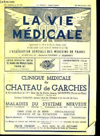 IMP. LANG, BLANCHONG et Cie.. 25 décembre 1937. In-8. Broché. Bon état, Couv. convenable, Dos satisfaisant, Intérieur frais. Paginé de 829 à 868. Encars publicitaires illustrés en noir et blanc. Quelques pages cornées.. . . . Classification Dewey : 610-Sciences médicales. Médecine