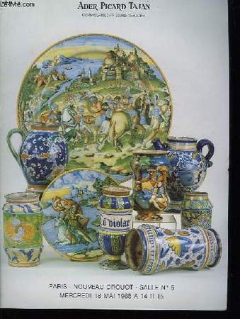 5 vol. in-4 br., couv. ill. couleurs, nombr. photos couleurs, Tajan, Hôtel Drouot, Paris, 2000, 2001 et 2002, de 37 pp. à 64 pp. par catalogue, env. 200 à 300 pièces par catalogue, avec les estimations. Rappel des catalogues : Porcelaines et faïences des XVIIe et XIXe siècles provenant principalement de la collection de Madame Diana Vierny (19 mai 2000) ; Porcelaines et faïences anciennes, principalement des XVIIIe et XIXe siècles (24 novembre 2000) ; Collection Lucien et Hélène Mellerio, Besnier et divers amateurs [...] (13 juin 2001) ; Faïences et porcelaines du XVIe au XIXe siècle (28 novembre 2001) ; id. (10 juillet 2002)