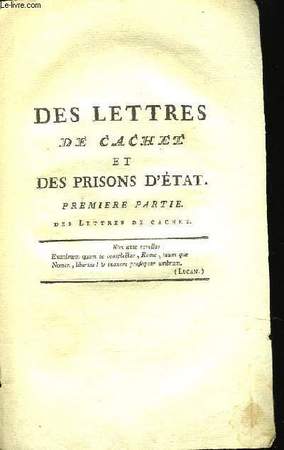 Une lettre de cachet est, sous l’Ancien Régime en France, une lettre servant à la transmission d’un ordre du roi, permettant l'incarcération sans jugement, l'exil ou encore l'internement de personnes jugées indésirables par le pouvoir. Une lettre de cachet peut être expédiée du mouvement du roi — c'est la lettre de «grand cachet». C’est typiquement le cas des incarcérations politiques, telles celles de Voltaire ou de Diderot.Elle peut également l’être sur requête d'un particulier — c'est la lettre de «petit cachet». Ainsi, Voltaire lui-même requiert une lettre de cachet pour l’incarcération d'une tripière menant tapage dans le voisinage. En effet, cette intervention est théoriquement réservée à des petits délits, à l'exclusion des crimes. Elle est souvent demandée pour des affaires privées où les plaignants veulent agir rapidement et sans tapage public. Second tirage à la date de l'originale. L'ouvrage composé durant les 4 années d'incarcération de Mirabeau à Vincennes, est un réquisitoire contre la justice arbitraire et le pouvoir. Il débute par une histoire du droit pénal français, et poursuit sur l'organisation de l'administration pénitentiaire à la fin de l'Ancien Régime, qu'il dénonce violemment. "Des lettres de cachet n'est pas seulement une éloquente protestation contre le despotisme, un plaidoyer chaleureux en faveur de la liberté individuelle, mais encore un véritable travail d'érudition rempli d'exemples historiques, et qui suppose d'immenses lectures" (Barbier). L'attribution à Mirabeau est donc parfois contestée, en faveur de son oncle, car le texte renfermerait en effet trop de citations pour avoir été composé en prison. Le 2e volume est rare car il aurait été détruit par les autorités prussiennes, à la requête du gouvernement français. Bon état d’occasion