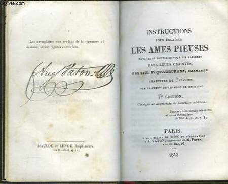 VATON Auguste. 7ème édition.. 1843. In-18. Relié plein cuir. Bon état, Couv. convenable, Dos satisfaisant, Intérieur frais. 321 pages. Relié plein cuir marron. Tranches dorées.. . . . Classification Dewey : 200-RELIGION
