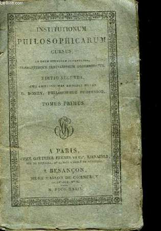 GAUTHIER FRERES & Cie. 2nde édition. 1823. In-12. Broché. Etat d'usage, Couv. défraîchie, Dos satisfaisant, Intérieur acceptable. 368 pages. Papier à la forme. Charnières légèrement fendues en coiffes. Ouvrage en latin. Quelques traces d'humidité en début d'ouvrage.. . . . Classification Dewey : 190-Philosophie occidentale moderne