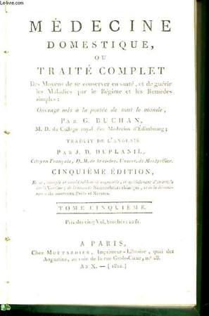 Ou Traité Complet des Moyens de se conserver en santé, et de guérir les Maladies, par le régime & les remèdes simples. Traduit de l'anglais par J.D. Duplanil. Classification Dewey : 610-Sciences médicales. Médecine