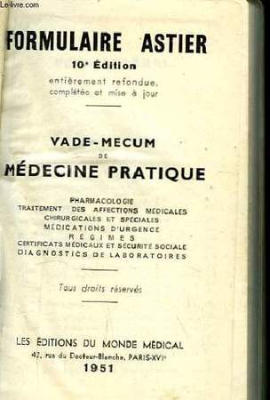 Masson et cie 1960 in12. 1960. Reliure editeur. Formulaire Astier. Mémento de médecine pratique. Pharmacologie. Traitement des affections médicales chirurgicales et spéciales. Médications d'urgence. Régimes. Certificats médicaux et sécurité sociale. Diagnostics de laboratoires. Editions Masson et Cie. 1960