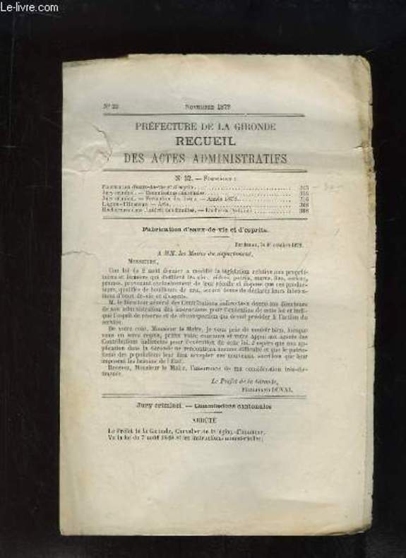 IMPRIMERIE ADMINIS. RAGOT. Nov 1872. In-8. En feuillets. Etat d'usage, Couv. légèrement passée, Dos satisfaisant, Déchirures. Fascicule de 4 pages, paginées de 315 à. . . . Classification Dewey : 908.447-Régionalisme : Aquitaine
