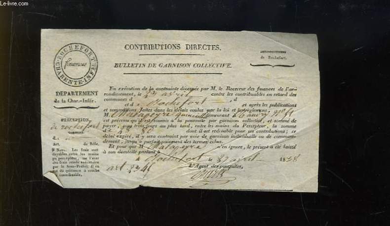 CHEZ L'AUTEUR. 27 avril 1838. In-12. Broché. Bon état, Couv. convenable, Dos satisfaisant, Intérieur frais. 1 document imprimé de 8.5 x 15 cm ( à l'italienne ), rempli à la plume.. . . . Classification : 1700-Documents Divers