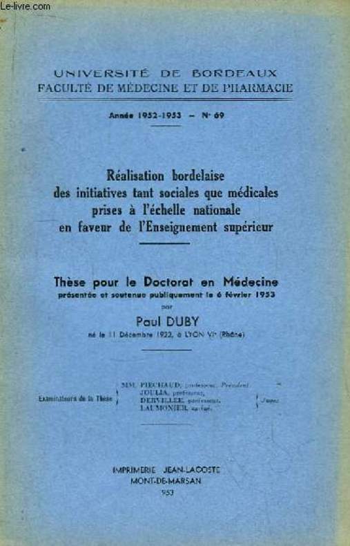 Université de Bordeaux - Faculté de Médecine et de Pharmacie, Année 1952 - 1953 Classification Dewey : 610-Sciences médicales. Médecine