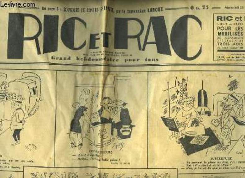 IMPRIMERIES RICHELIEU. 11 octobre 1939. In-12. Broché. Etat d'usage, Couv. légèrement passée, Dos satisfaisant, Intérieur acceptable. Journal de 6 pages. Quelques dessins et bandes dessinées en noir et blanc. Quelques accrocs en marges.. . . . Classification Dewey : 70.1-Journaux