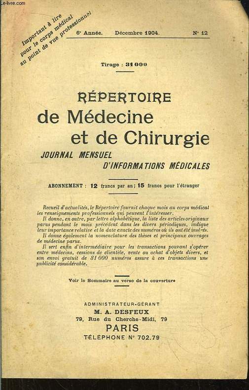 IMP. LAHURE. Décembre 1904. In-12. Broché. Bon état, Couv. convenable, Dos satisfaisant, Intérieur acceptable. 32 pages. Quelques pages cornées.. . . . Classification Dewey : 610-Sciences médicales. Médecine
