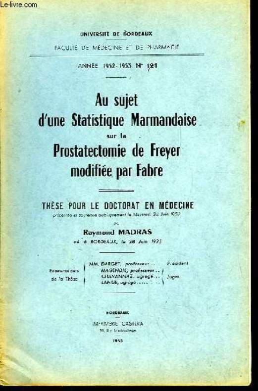 Université de Bordeaux - Faculté de Médecine et de Pharmacie. Année 1952 - 1953 Classification Dewey : 610-Sciences médicales. Médecine