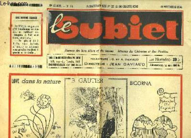 CHEZ L'AUTEUR. 15 novembre 1954. In-12. Broché. Bon état, Couv. convenable, Dos satisfaisant, Intérieur frais. Journal en parlanjhe (saintongeais) de 4 pages. Quelques dessins en noir et blanc, dans le texte de Love, Gilbert, Bigorna, B. Gauthier.. . . . Classification Dewey : 70.1-Journaux
