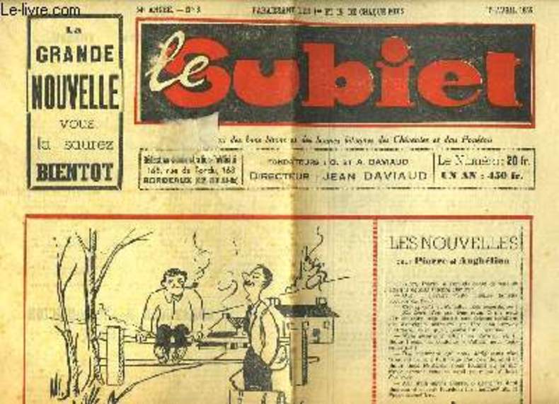 CHEZ L'AUTEUR. 15 avril 1955. In-12. Broché. Bon état, Couv. convenable, Dos satisfaisant, Intérieur acceptable. Journal en parlanjhe (saintongeais) de 4 pages. Quelques dessins en noir et blanc, dans le texte.. . . . Classification Dewey : 70.1-Journaux