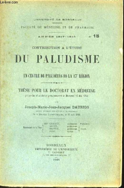 Université de Bordeaux - Faculté de Médecine et de Pharmacie. Année 1917 - 1918 Classification Dewey : 610-Sciences médicales. Médecine