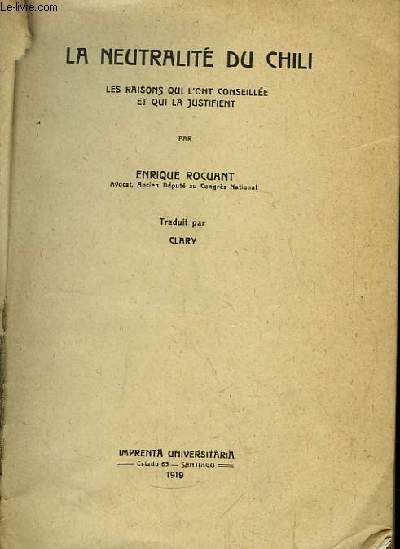 IMPRENTA UNIVERSITARIA. 1919. In-12. Broché. Etat d'usage, Couv. défraîchie, Dos satisfaisant, Intérieur acceptable. 316 pages. Quelques planches de portrait en noir et blanc. Dos renforcé par une bande, avec code de bibliothèque sur la coiffe en-tête. Tampons de bibliothèque dans quelques marges.. . . . Classification Dewey : 983-Chili