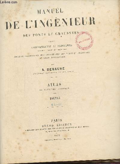 1872 Paris, Dunod 1872, petit in-4 reliure demi-basane vert, dos lisse, titre doré, 135 pp. Manuel rédigé conformément au programme annexé au décret du 7 mars 1868, réglant l'admission des conducteurs des Ponts et Chaussées au grade d'ingénieur. 5e fascicule, avec 98 figures et 7 planches dépliantes (dont 1 en couleurs) : Géodésie, Nivellement, Levé des plans. Quelques rousseurs, sinon bon état.