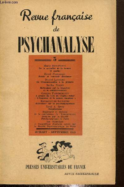 Sommaire : Marie Bonaparte : de la sexualité de la femme- Flournoy Henri, poésie et souvenir d'enfance- Daniel Lagache, de l'homosexualité à la jalousie. Classification Dewey : 70.49-Presse illustrée, magazines, revues