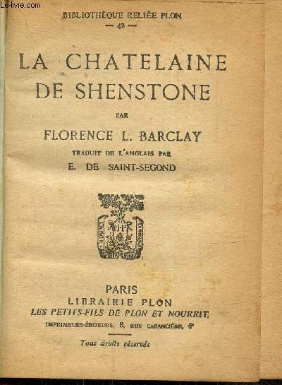 LIBRAIRIE PLON Sans date. Florence L. Barclay - La Châtelaine de Shenstone / Librairie Plon