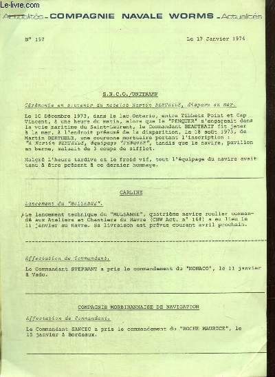 Compagnie Navale Worms. 1974. In-4. Broché. Bon état, Couv. convenable, Dos satisfaisant, Intérieur frais. 6 + 13 pages.. . . . Classification Dewey : 386-Marine