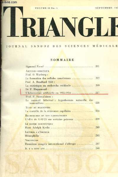 Sommaire : La formation des cellules cancéreuses (O. Wartburg) / La statistique en recherche médicale (A. Bradford Hill) / L'hibernation artificielle en 1955-1956 (P. Huguenard) /... Classification Dewey : 610-Sciences médicales. Médecine