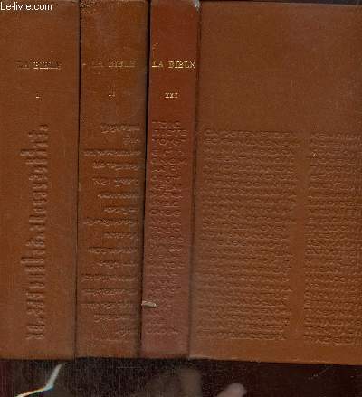 Le Club français du Livre 1964 Volume 1: Le Pentateuque - Les Livres historiques Volume 2: Les livres poétiques et sapientiaux les livres prophétiques - Volume 3: Le Nouveau Testament 4048 pages - Reliure cuir Jacques DarcheEngels Bon état 2 450 g