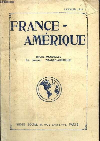 Comité France-Amérique. 1912. In-4. Broché. Etat d'usage, Couv. défraîchie, Dos satisfaisant, Intérieur acceptable. 68 + 12 pages. 2 illustrations en noir et blanc hors texte.. . . . Classification Dewey : 970-Histoire générale de l'Amérique du Nord