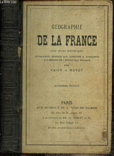 Bureaux du Bulletin des Examens. Non daté. In-12. Cartonné. Etat d'usage, Coins frottés, Dos abîmé, Papier jauni. 530 pages.. . . . Classification Dewey : 372.89-Livre scolaire : histoire / géographie