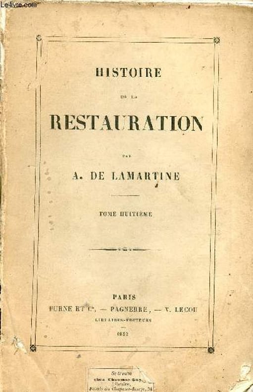Histoire de la Restauration, Tome I - VIII Tome Premier : Restauration de 1814 - Cent Jours, 624 pp Tome Deuxième : Restauration de 1814 - Cent Jours, 675 pp avec carte dépliante Tome Troisième : Régne de Louis XVIII - Chambre de 1815, 664 pp , 1863 Tome Quatrième : Régne de Louis XVIII - Ministère Richelieu et Decazes, 555 pp, 1865 Tome Cinquième : Régne de Louis XVIII, 671 pp, 1866 Tome Sixième : Régne de Louis XVIII, Ministère de M De Villèle - Première phase ( dec 1821 - sept 1824 ), 796 pp, 1868 Tome Septième : Régne de Charles X , seconde phase ( sept 1824 - jan 1828 ) 651 pp , 1869 Tome Huitième : Régne de Charles X ( jan 1928 - juil 1830 - révolution de juillet )754 pp , 1872 22 x 15 cm, reliure demi-cuir vert foncée, dos à 4 nerfs orné, bon état