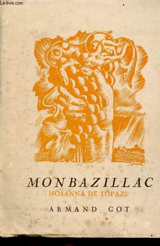 Armand GOT, « Monbazillac – Hosanna de Topaze », Les Editions d’Aquitaine, Bordeaux, 1949, 102 pages+carte+table. Envoi de l’auteur en page de faux titre. Couverture par Gaston Marty, Photographies de Rodolphe Germain, Carte de Eric Kuntzel. Broché. Rousseurs en couvertures. Intérieur très bon. Nombreuses photos noir et blanc.