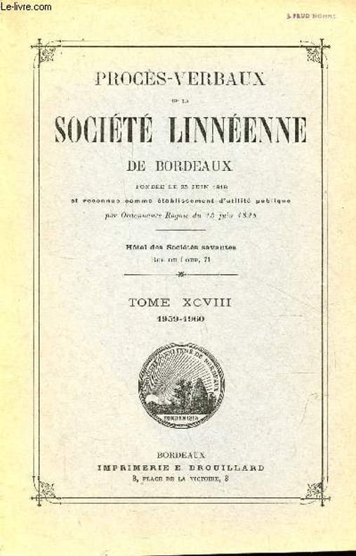 Sommaire : Quelques échantillons végétaux - à propos de la recherche microchimique de l'amidon dans les grains de pollen influence de l'altitude - sur la présence de la coronelle lisse dans la vallée de Luz Saint Sauveur - à prpos de l'héliotactisme des zoospores d'enteromorpha linza - une intoxication par des baies de morelle - le plomb des arbres fruitiers provoqués par le stereum purpureum - plantes provenant du jardin botanique de Bordeaux - au sujet d'amanita phalloides - détermination générique et spécifique du pollen de quelques ericacées - la géologie du bazadais - les phases marines du Burdigalien aquitain etc. Classification Dewey : 908.447-Régionalisme : Aquitaine