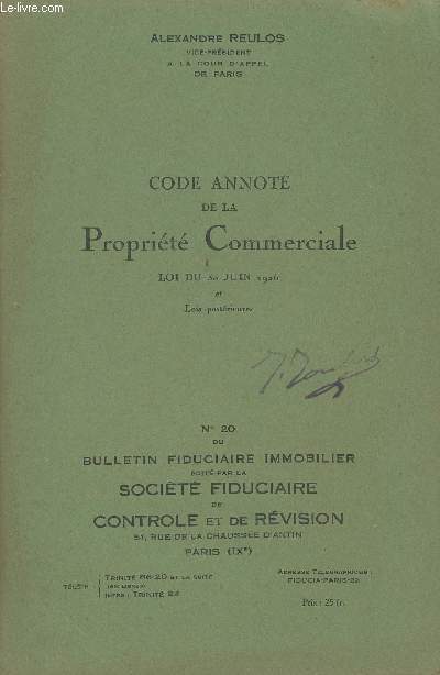 Société fiduciaire de contrôle et de révision. Non daté. In-12. Broché. Bon état, Couv. convenable, Dos fané, Intérieur bon état. 206 pp., 58 pp. d'annexes paginées enchiffres romains. N° 20 du Bulletin Fiduciaire Immobilier.. . . . Classification Dewey : 346.04-Propriétés