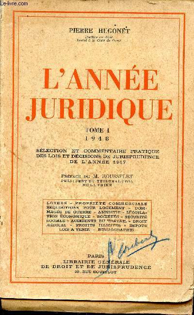 Librairie générale de droit et de jurisprudence.. 1948. In-12. Broché. Etat d'usage, Coins frottés, Coiffe en pied abîmée, Intérieur bon état. 389 pp., dos plié et frotté. Préface de M. Rousselet. Découpure de presse du Juris-classeur de procédure civile.. . . . Classification Dewey : 348-Lois, règlement, jurisprudence