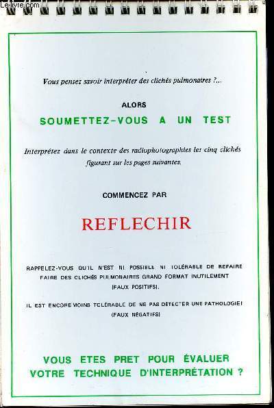 Editions de l'Aulne. S.d.. In-8. Relié. Parfait état, Couv. fraîche, Dos impeccable, Intérieur frais. Non paginé. Brochure d'une vingtaine de pages sur papier glacé épais. Reliure avec spirale métal blanc. 5 cliclés radiophotographiques. Explications et corrigés in fine.. . . . Classification Dewey : 614-Santé publique, médecine préventive