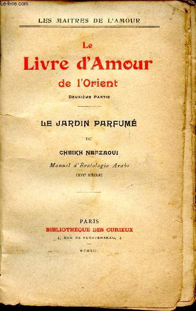 Bibliothèque des curieux. 1912. In-8. Broché. A restaurer, 2ème plat abîmé, Coiffe en pied abîmée, Intérieur bon état. 274 pp. Couverture en papier craft, dos plié, coiffe en tête abîmée, manque sur 2ème plat. Manquent les dernières pages - 1 PHOTO DISPONIBLE.. . . . Classification Dewey : 152.4-L'amour