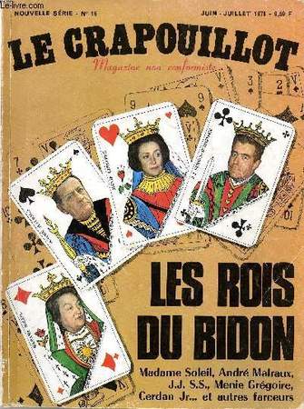 Paris, Société d'Éditions Parisiennes Associées, 1971 ; in-4, 100 pp., broché. Sommaire: Le bidon en Astrologie: le Premier des astres: Mme Soleil, industrielle de la voyance, par Adrien BRÉHAT; le Bidon dans le Spectacle: dégonflons les baudruches, par Jean HEYRAS; le Bidon du Cœur: Ah! Frappe-toi le cœur, c'est là qu'est la Menie…, par J.-C. PERROY; le Bidon dans l'Érotisme: les Imposteurs du postérieur, par Jean LORRY; le Bidon dans la Politique: les Ji-gymnastiques de J.-J. S.-S., par Xavier MARGERIDE; le Bidon dans la Science: restons sérieux Docteur Tournesol, par Jacques BERGIER; le Bidon dans la Littérature: les vrais Mémoires de l'anti-Malraux, par Jean BOURDIER; le Bidon dans la Presse et la Publicité: comment on vous bourre le crâne, par Frédéric SOREL; le Bidon sur le ring: Cerdan Junior: un numéro bien au poing, par Emmanuel FRANÇOIS; le Bidon dans le Sport: les coulisses des faux exploits, par Albert CLARINVAL; le Bidon dans les Courses: les rigolos du tiercé à gogos, par SAINT-AUBIN.
