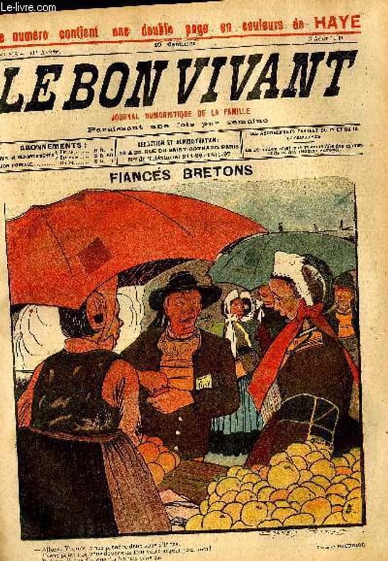 Illustration pleine page : Fiancés bretons par POURRIO ; Echos par HENRIOT ; Les courses sur routes par HAYE (gravure double pages) ; Empreintes digitales par RADIGUET Classification Dewey : 70.441-Journaux satiriques anciens