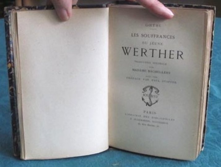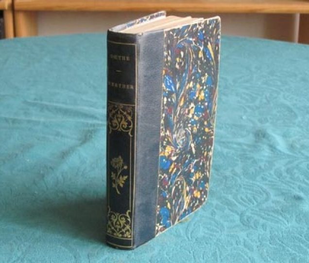 Les souffrances du jeune Werther. Traduction nouvelle de Madame Bachellery avec une préface par Paul Stapfer.Paris, Librairie des Bibliophiles E. Flammarion, successeur, non daté (vers 1900) - 227 pages.Reliure demi chagrin noir de l'époque. Dos lisse avec décor doré. Tête dorée. Couverture conservée. Signet. Pas de rousseur. Bon état. Format in-12°(18x11).